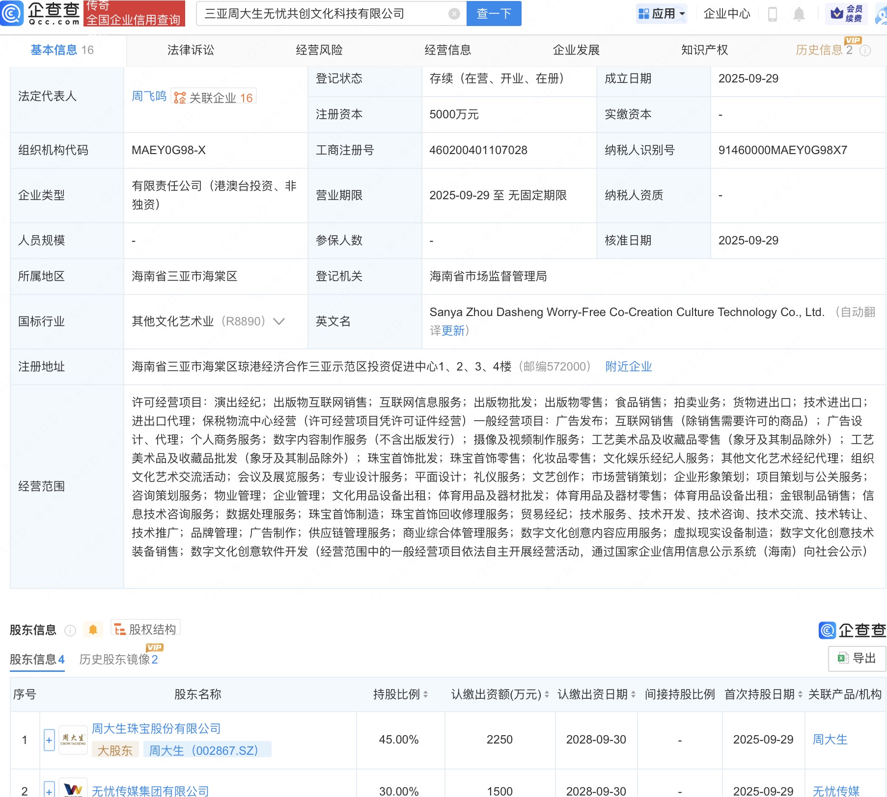 近日,三亚周大生无忧共创文化科技有限公司成立,法定代表人为周飞鸣,注册资本5000万人民币,经营范围包括演出经纪、出版物互联网销售、互联网信息服务等。企查查股权穿透显示,该公司由周大生(002867)、无忧传媒集团有限公司等共同持股。